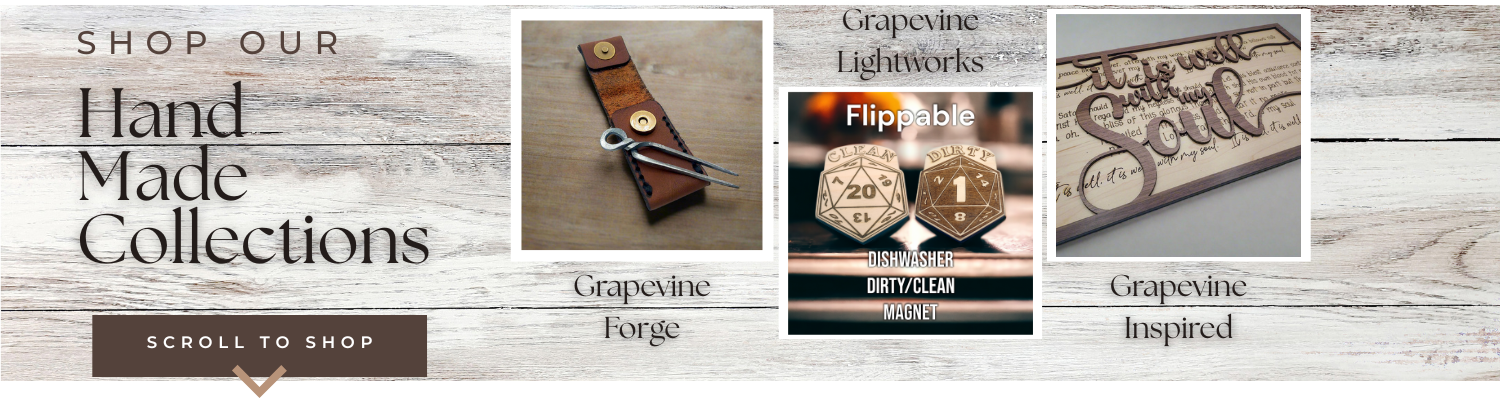 All items are hand made in the USA and will ship directly to you from our workshop as soon as they are completed. Please allow us time to make your new treasures. Our current processing time is 1 - 2 weeks on any hand forged blacksmith items from Grapevine Forge, and 2-3 days on any laser engraved items from Grapevine Lightworks.