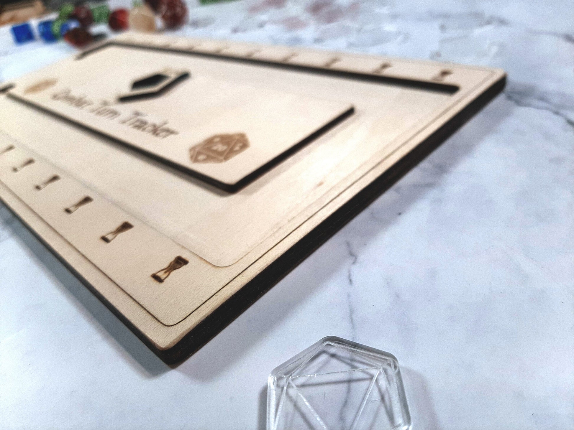 The Dungeon Master (or Game Master) has so many things to keep track of already, holding onto player and NPC initiative and turn position shouldn't be something they need to worry about. This wooden combat turn tracker is designed to hold simplify the task of combat management so you can focus on the fun! This tracker will hold the acrylic tokens securely and reliably through every battle. Simply use a dry-erase marker to write the character or creature's name on a token and place it easily into the slot to keep track of where they stand in the initiative list. A thumb notch is cut at each end of the turn track for easy removal of the tokens.