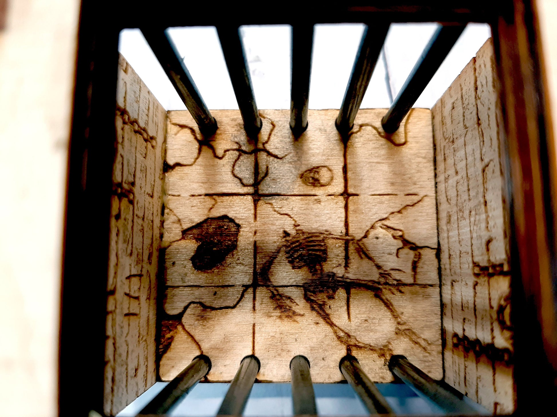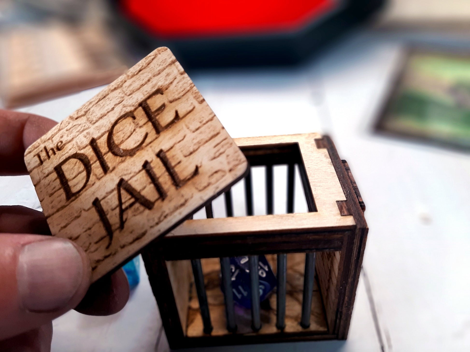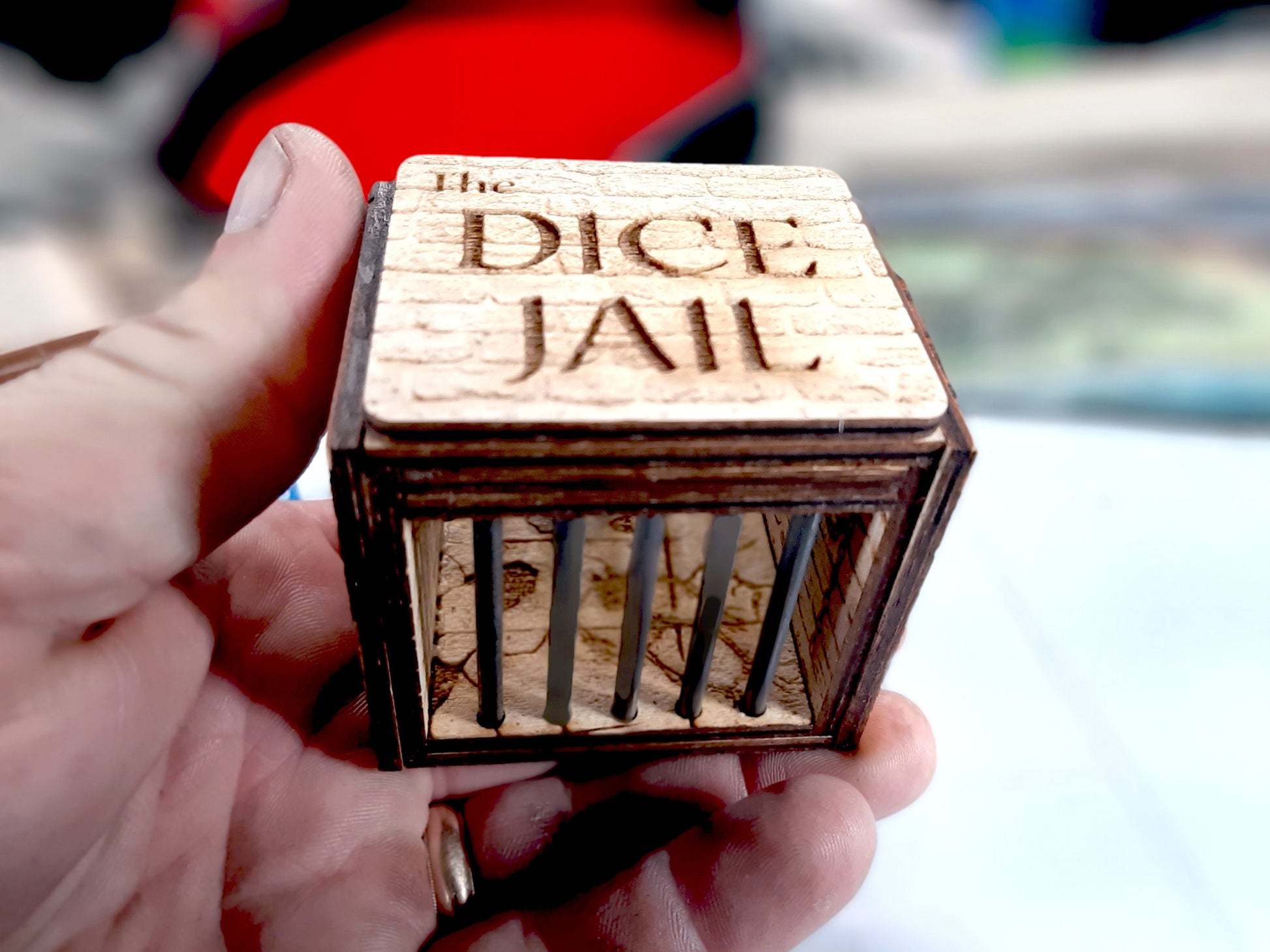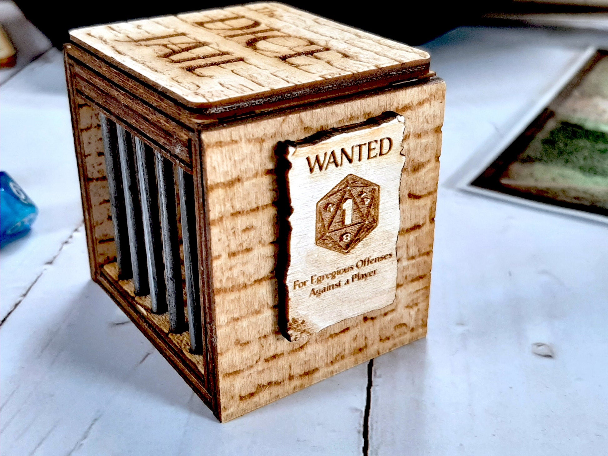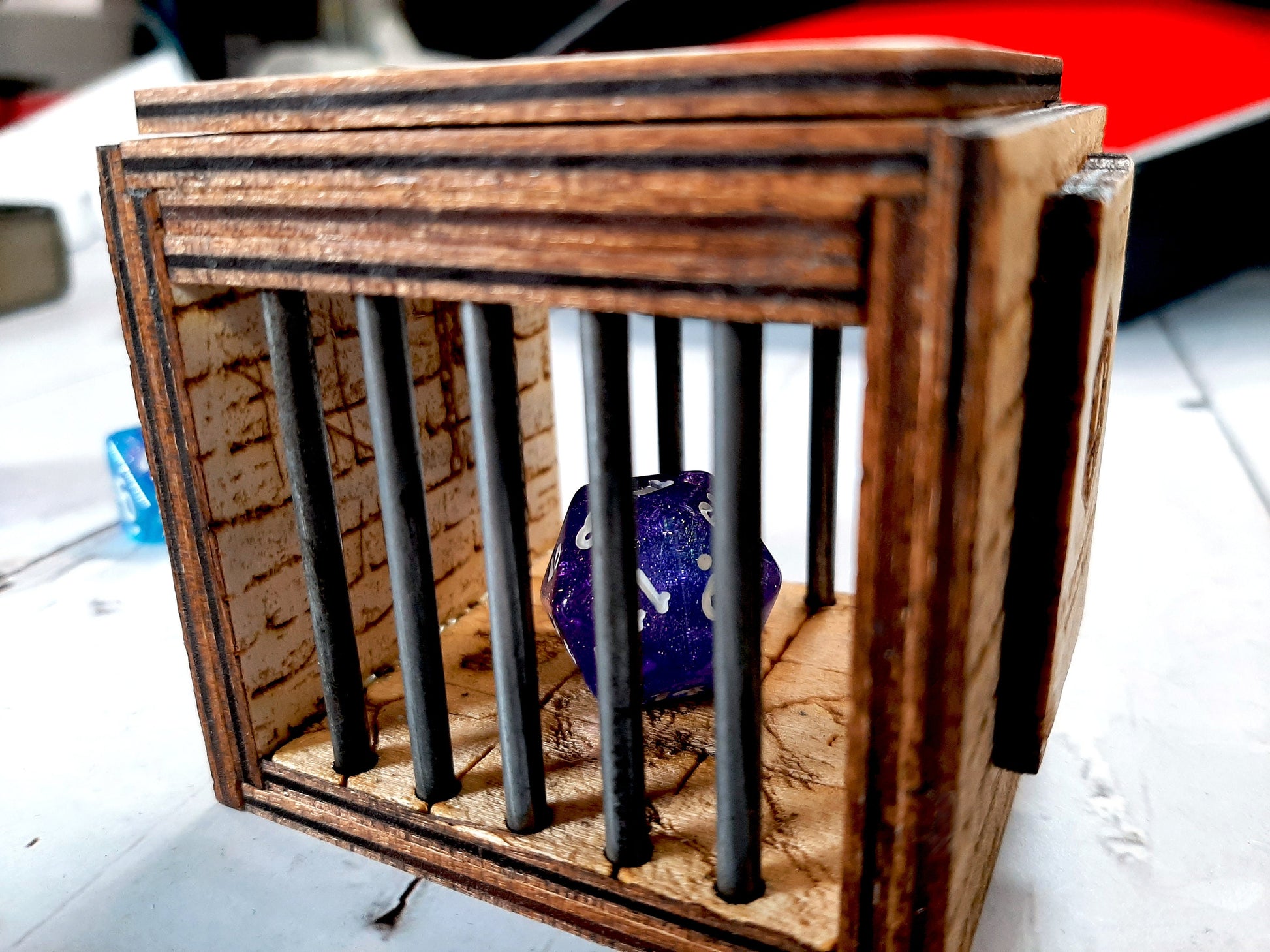 The Dice Jail is made from Baltic birch wood, laser engraved and reinforced with solid 1/8" round steel bars.