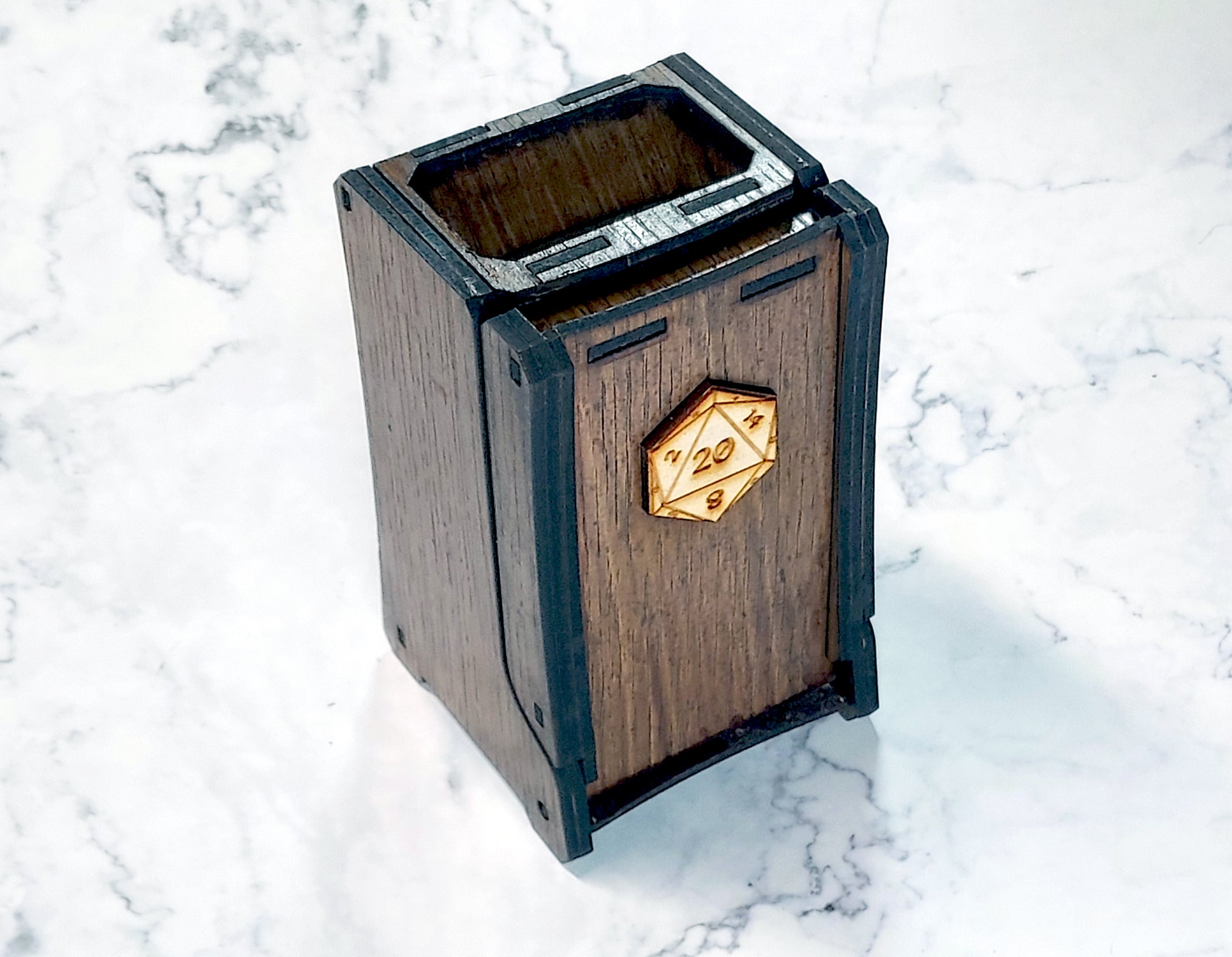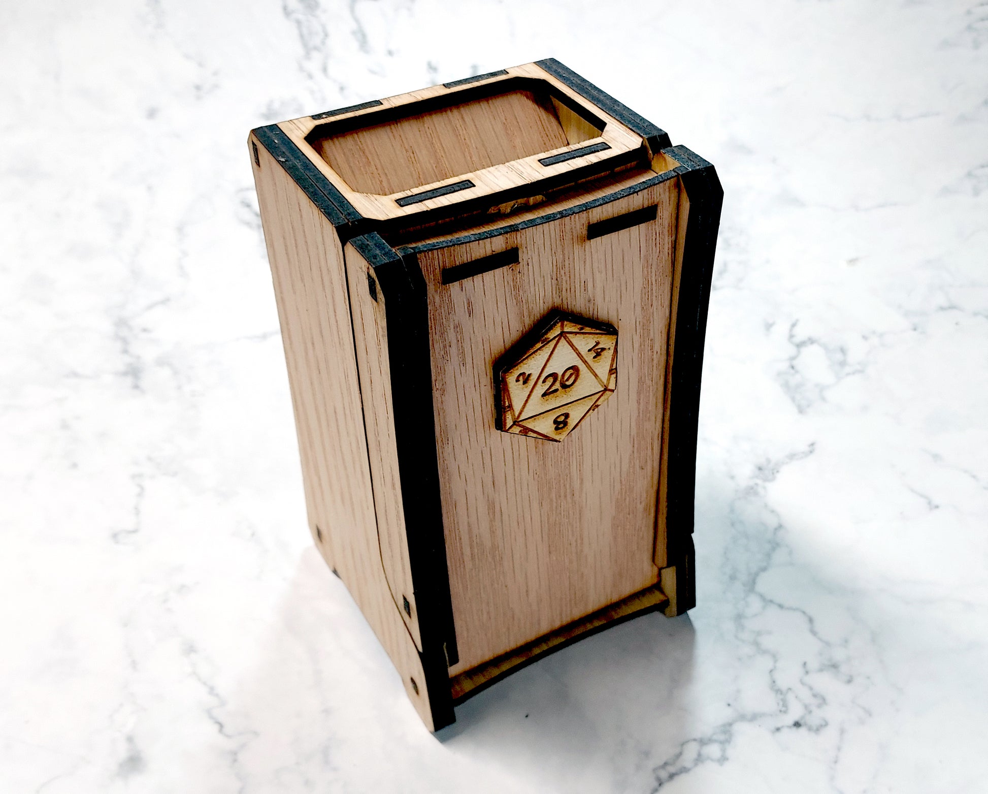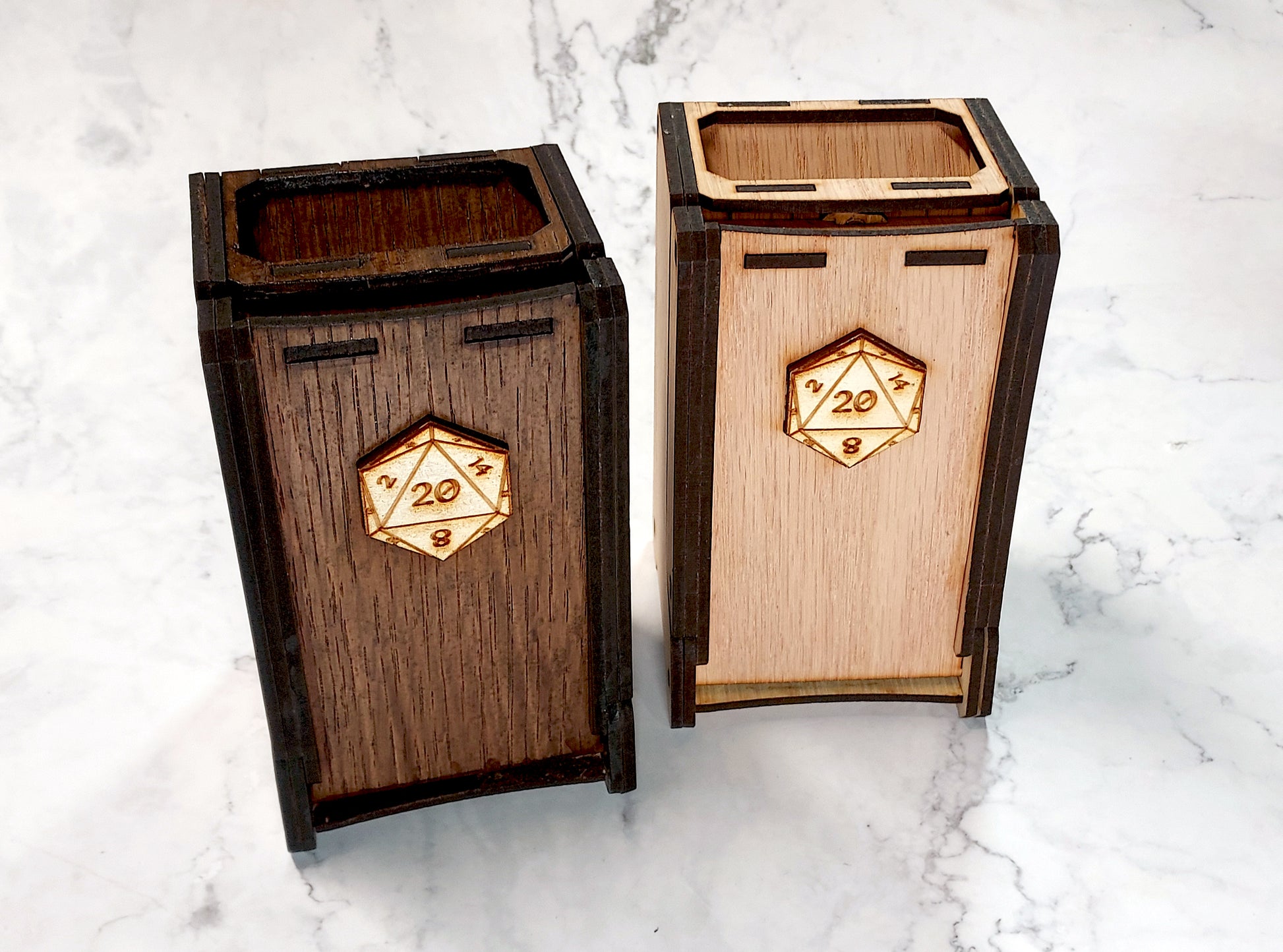 I use a beautiful red oak wood and add some enhancing engravings, as well as two D20 tokens attached to the tower to give dimension and add to the classic design.
