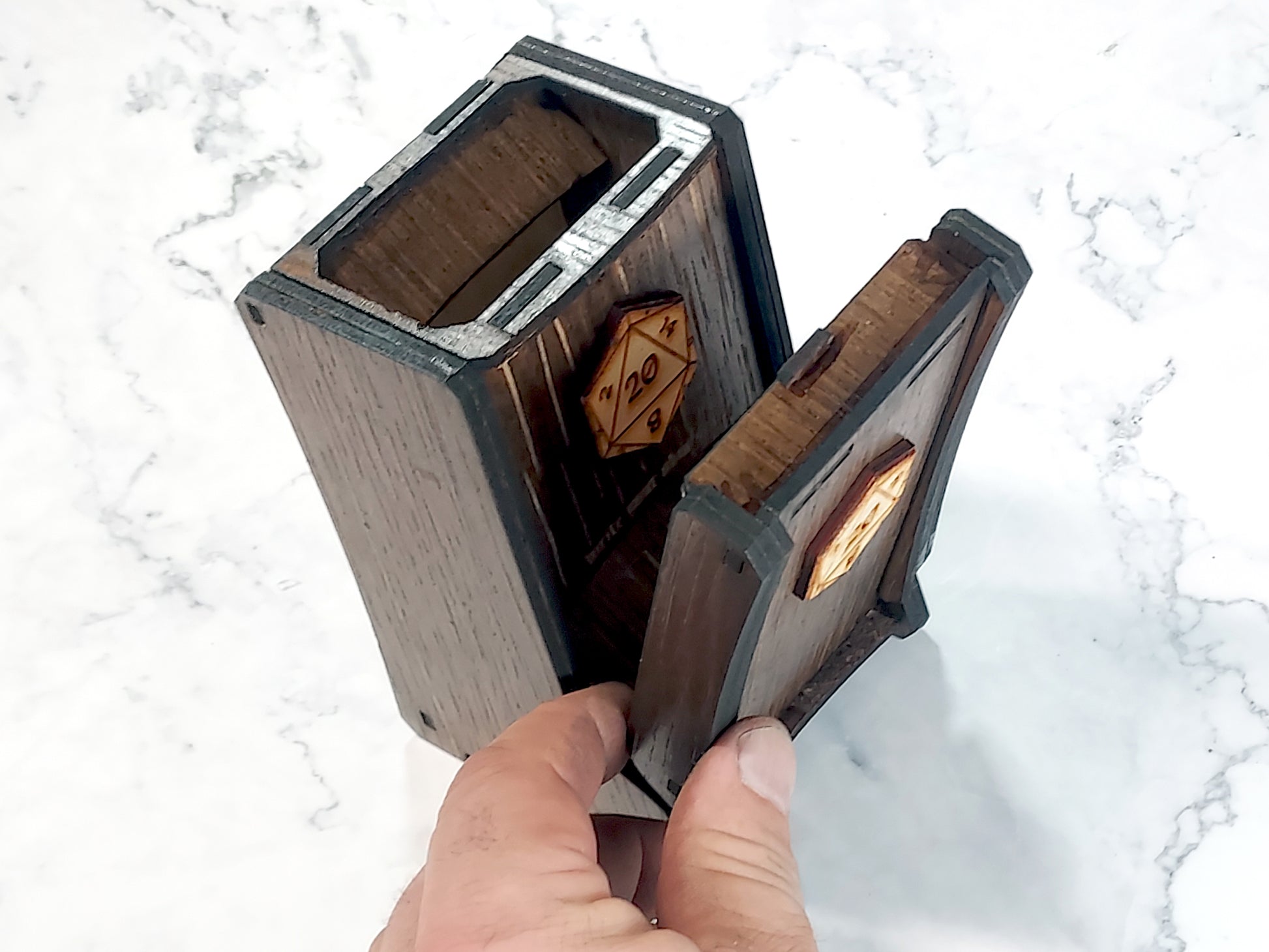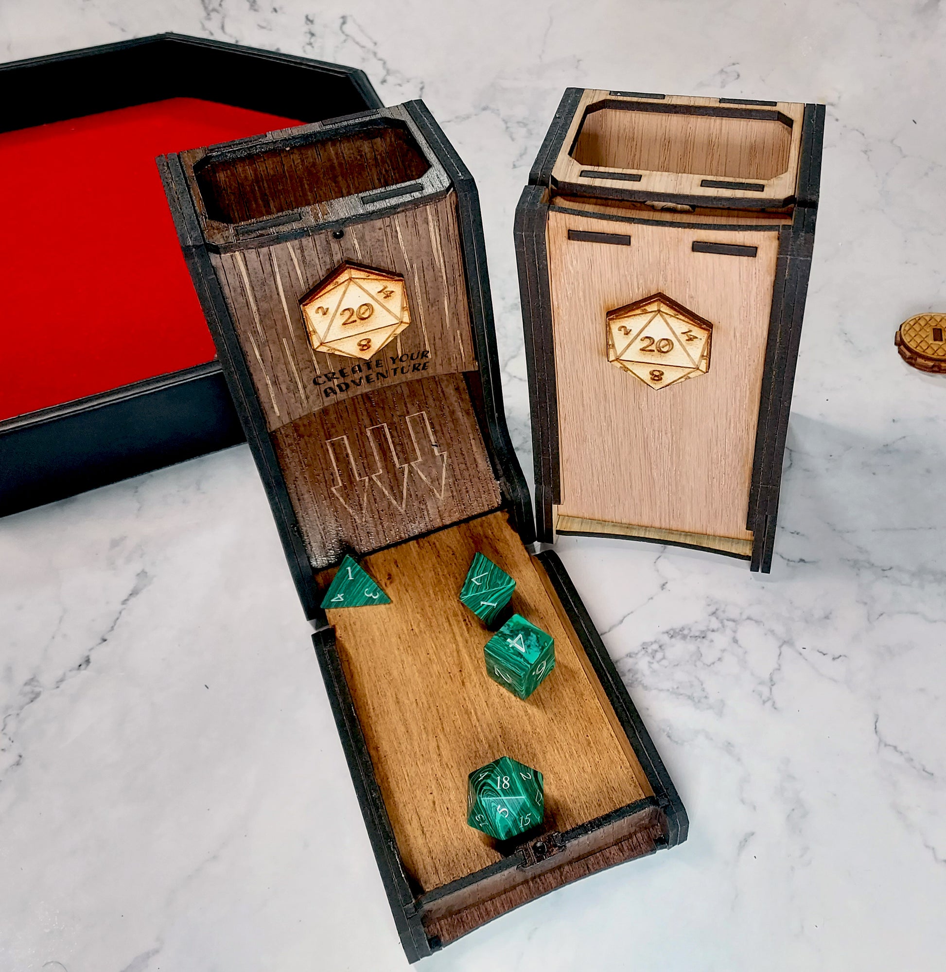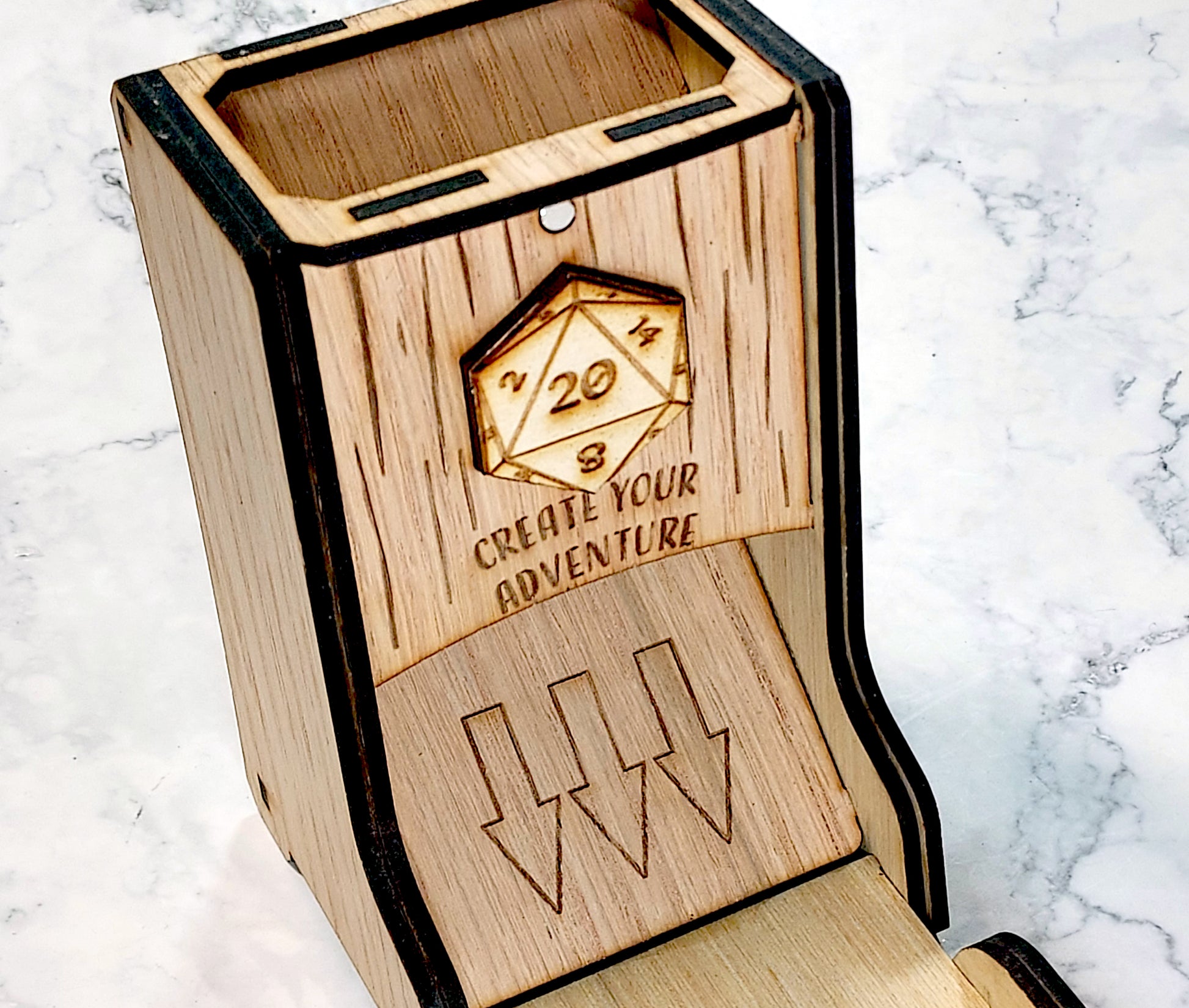 I use a beautiful red oak wood and add some enhancing engravings, as well as two D20 tokens attached to the tower to give dimension and add to the classic design.
