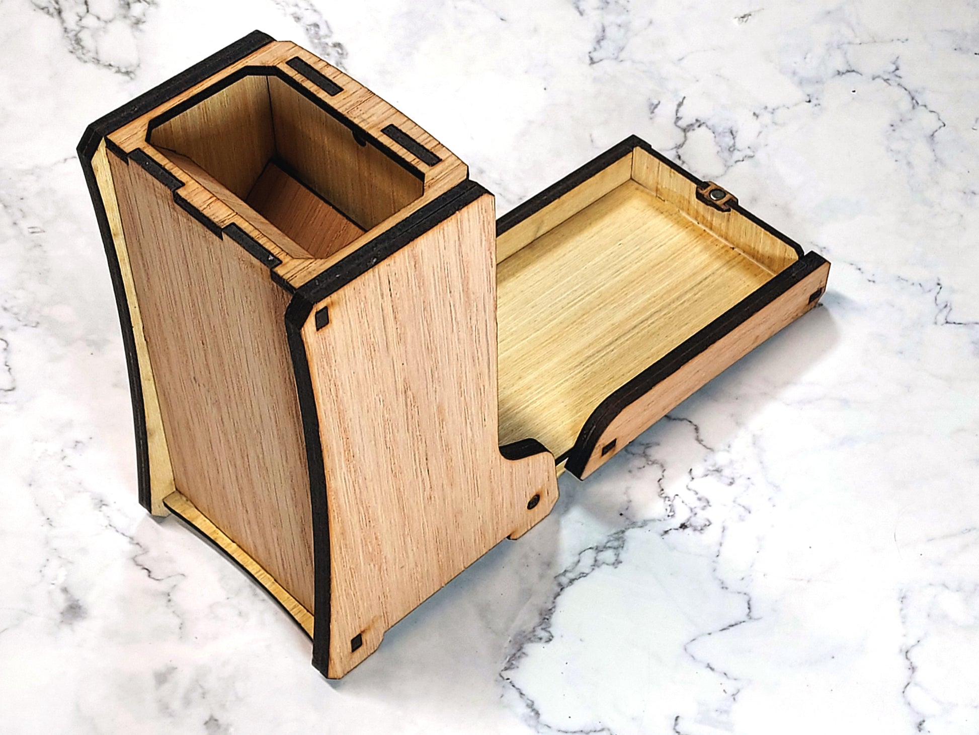 Dice rolling is a key part of any tabletop board game, especially role-playing games like Dungeons and Dragons and Pathfinder. Keep your dice rolls truly random, and enjoy the tactile feel and sound of rolling your dice in this beautiful wooden Dice Tower. Precision cut and engraved, then hand assembled and *stained (optional). This Dice Tower will certainly be a focal point at your game table.