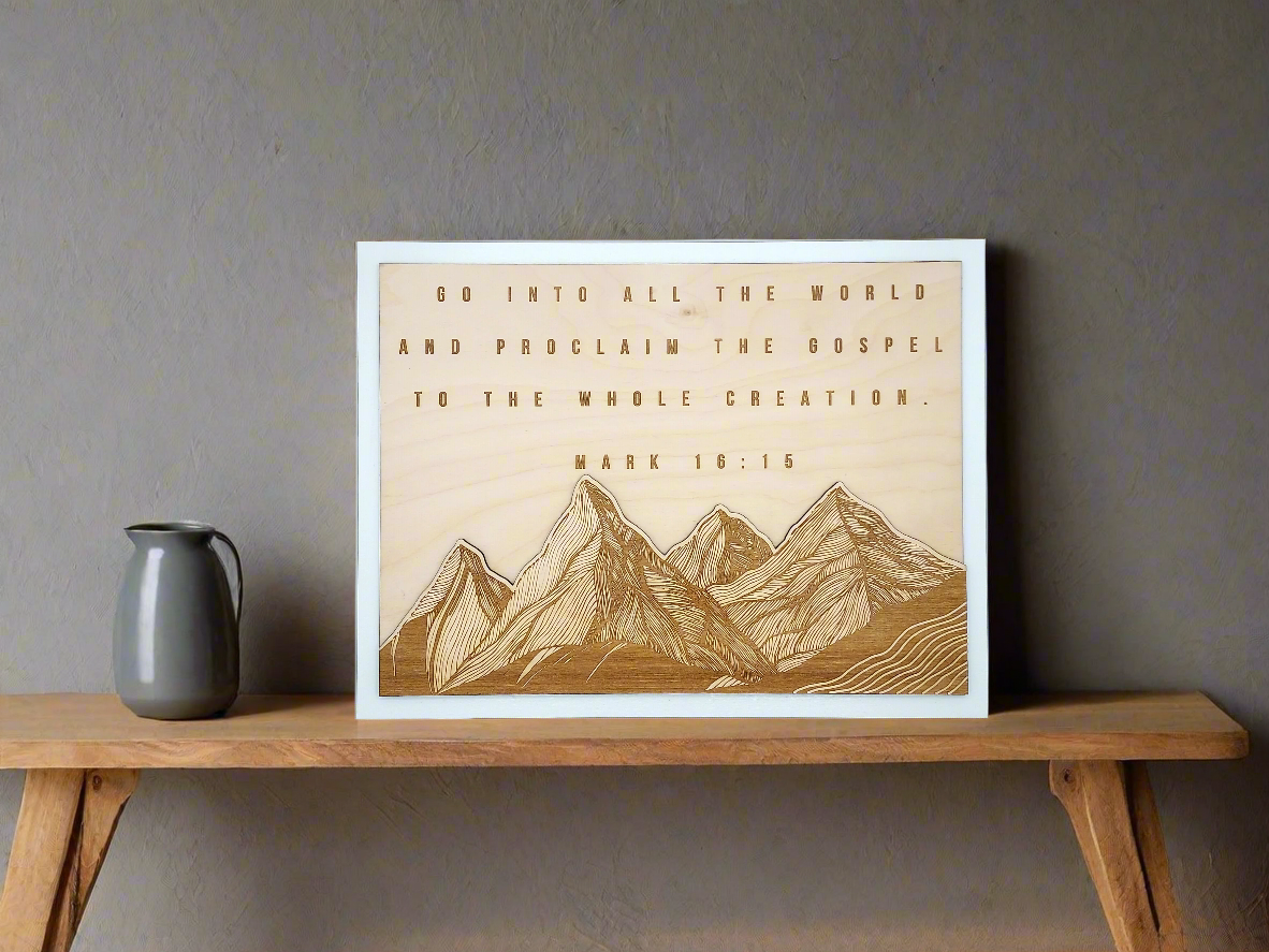 Go Into All the World – Mark 16:15 Wooden Mountain Sign | Christian Layered Wall Art | Scripture Decor