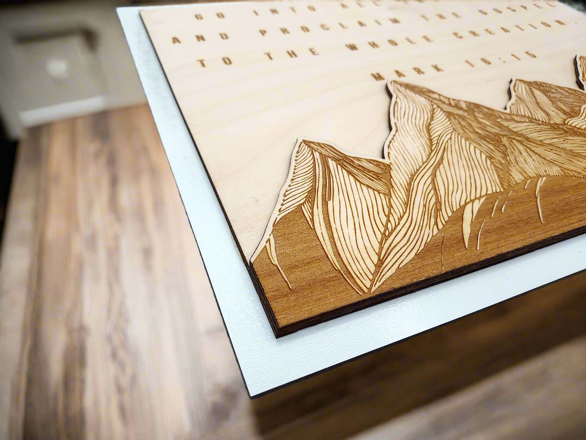 This inspiring piece is thoughtfully crafted with laser-engraved Scripture on natural birch, accented by dimensional wooden mountains layered beneath the verse. A crisp white backing border adds contrast and depth, creating a stunning, clean-lined frame that highlights both the message and the natural textures of the wood.
