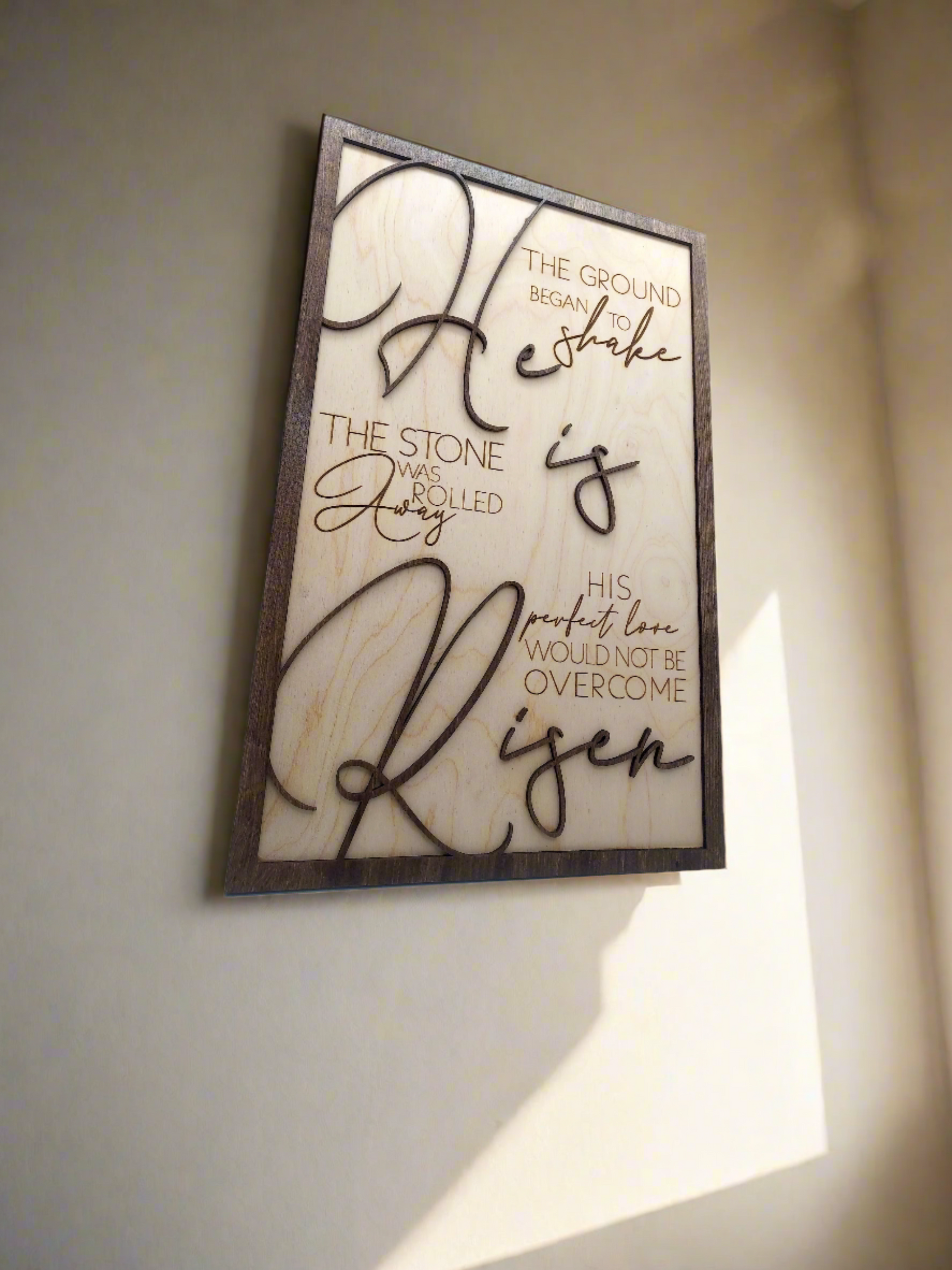 This 16" x 10.5" wood sign features a dimensional “He Is Risen” cutout in bold lettering, framed in a rich, dark-stained wood frame that adds warmth and depth to the design. The natural wood background is engraved with the moving words: