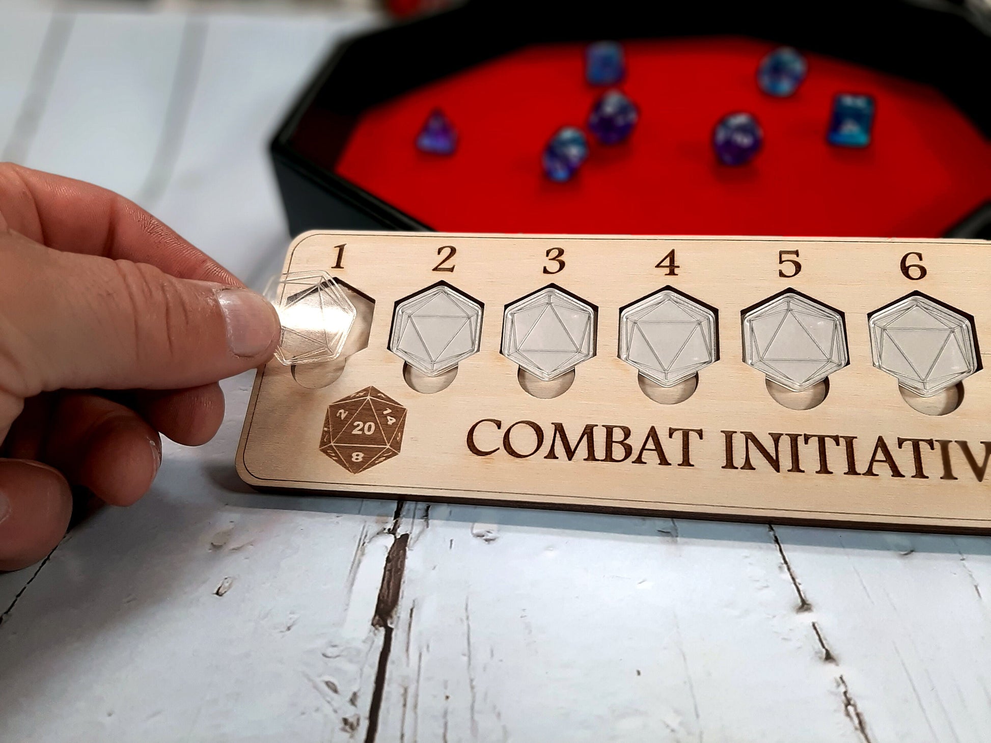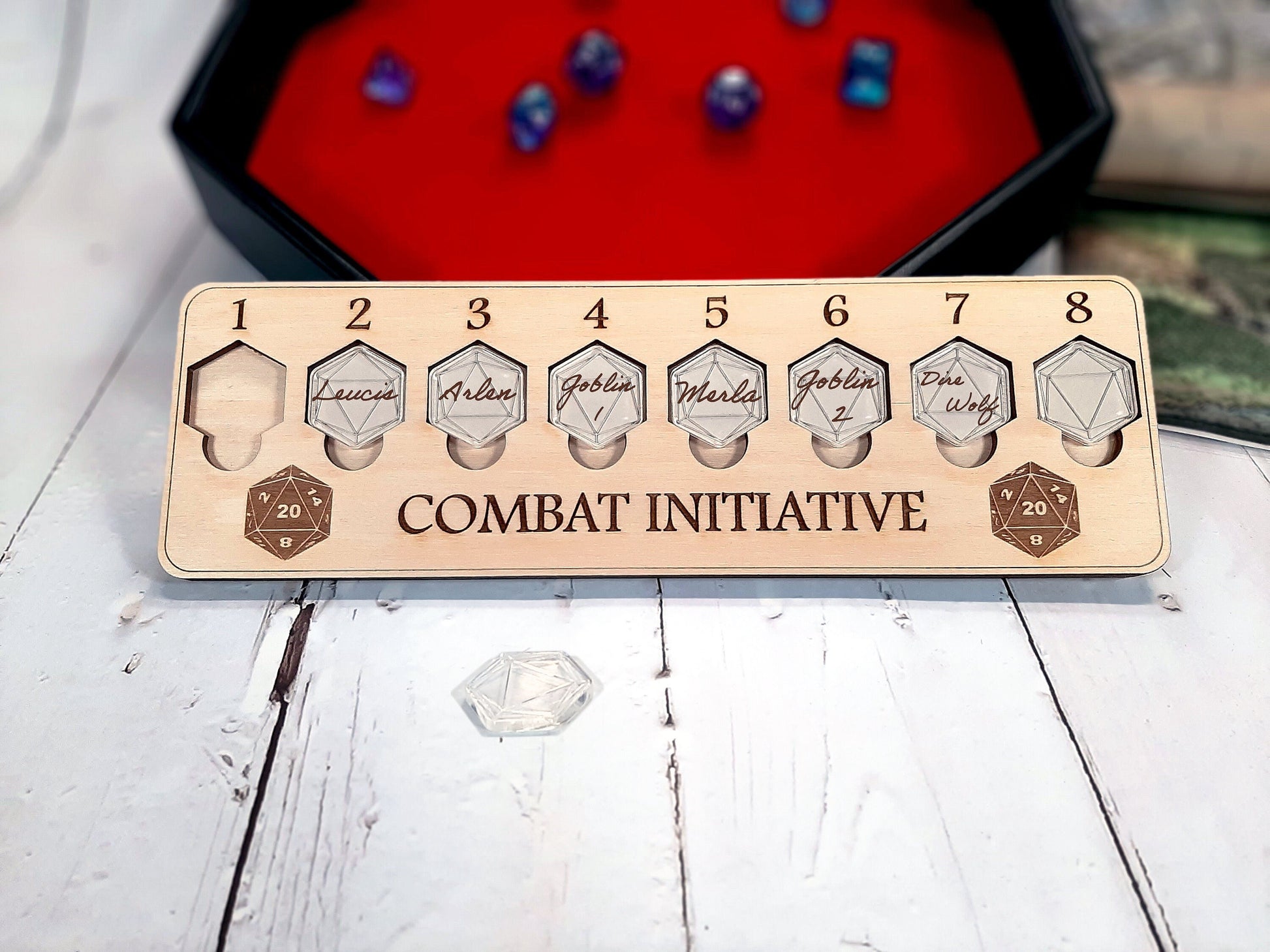 The acrylic tokens have been scored with a D20 symbol. The tracker itself is a made from solid birch and needs no assembly. It lies flat on the table while gaming and makes for easy storage and transportation with all of your other gaming gear. Tokens are made from clear acrylic and can be written on using a wet-erase marker (not included)