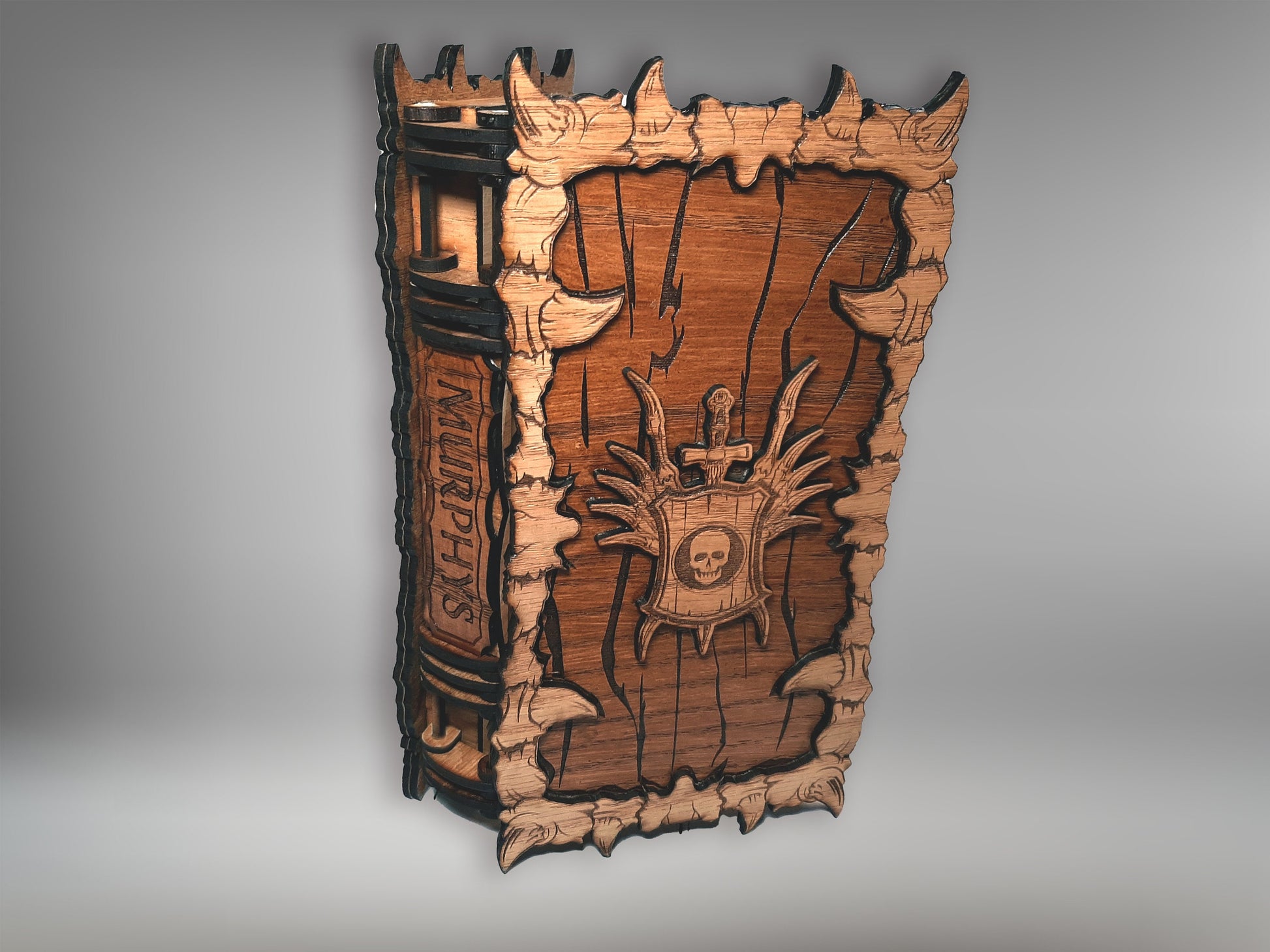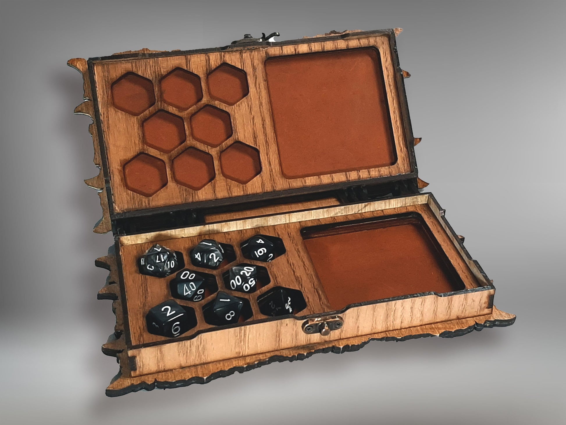 This box is precisely laser engraved, cut, then lovingly stained, assembled and tested to make sure that every box is of the highest quality possible. I use only the best, 100% leather on the inside ensuring a beautiful look and a premium feel on the rolling surface and storage areas for your dice. The box itself is cut from high quality red oak which is stained to give your dice box unmatched beauty and durability. The book latches closed with a metal hasp.