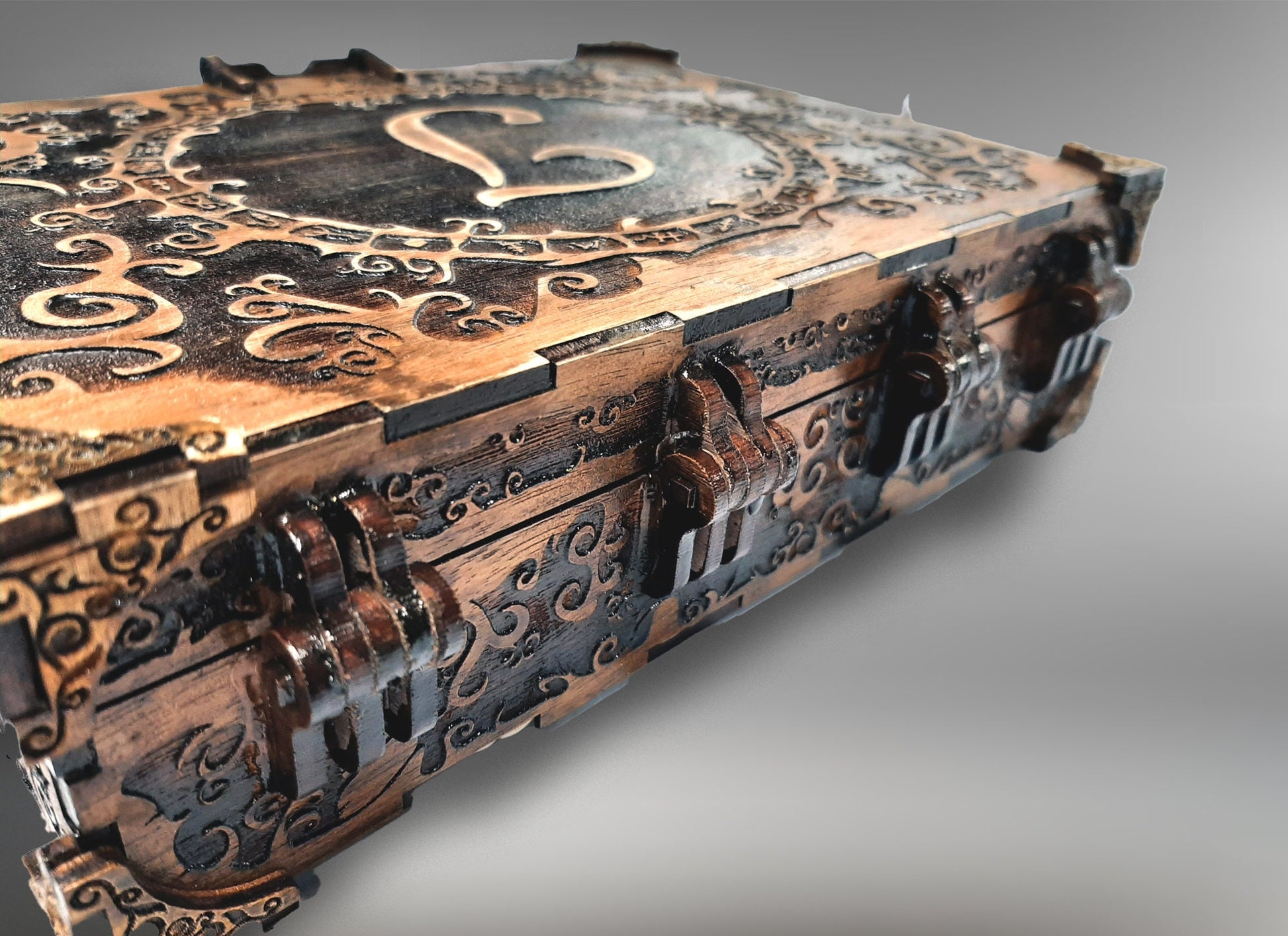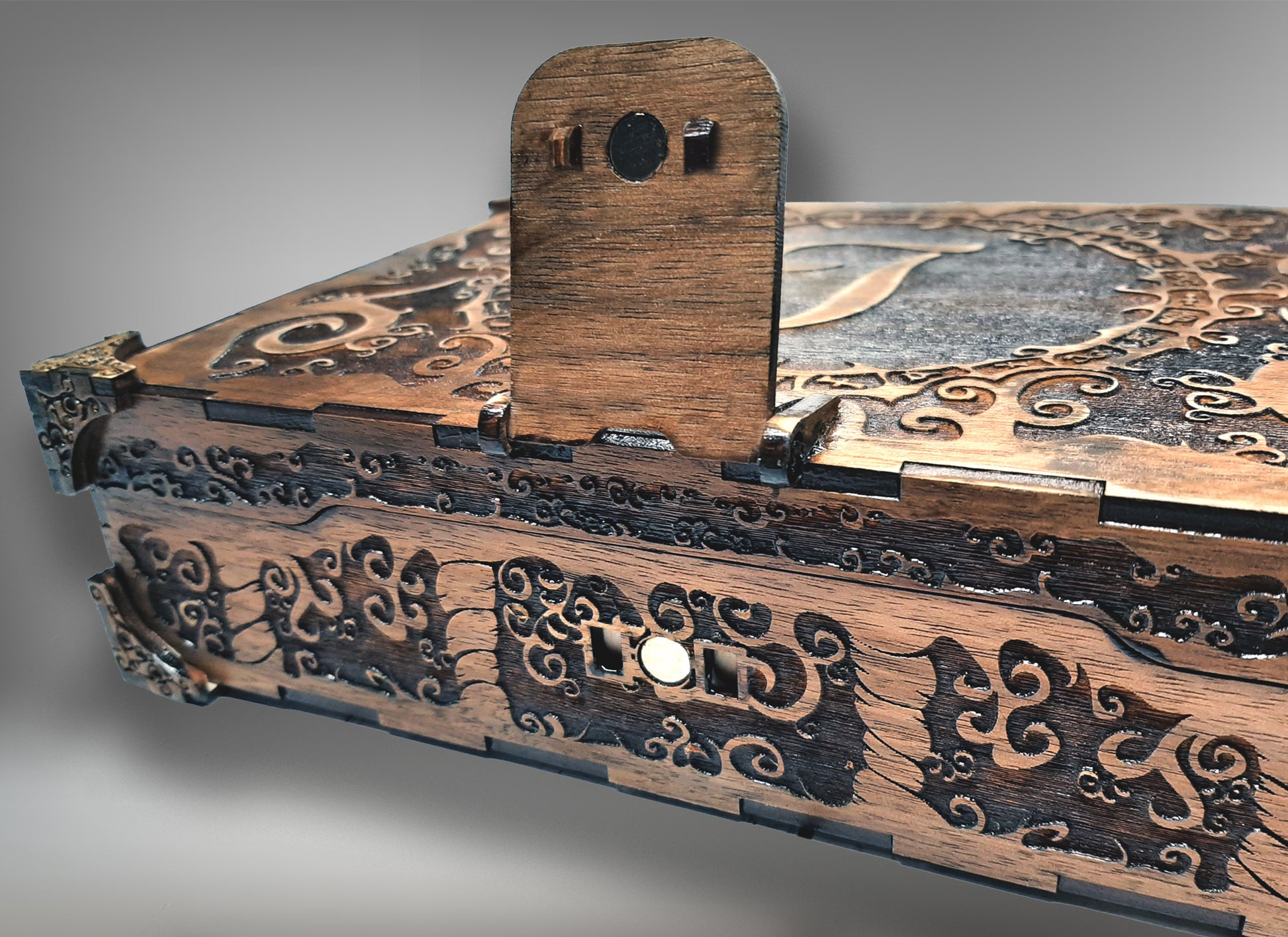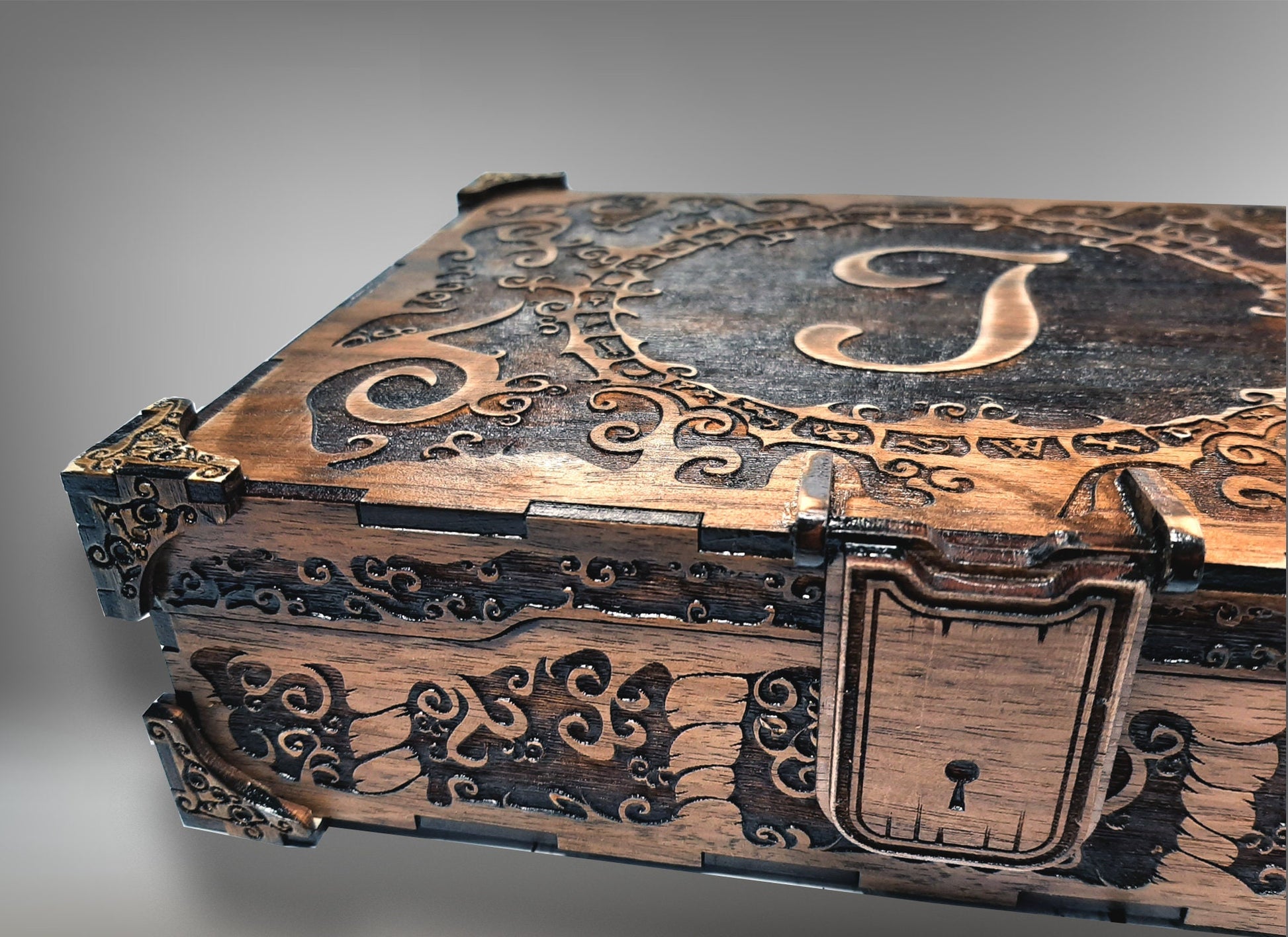 This box is precisely laser engraved, cut, then lovingly stained, assembled and tested to make sure that every box is of the highest quality possible. I use only the best quality materials ensuring a beautiful look and a premium feel for the box throughout. The box itself is cut from high quality wood which is hand stained giving your jewelry box unmatched beauty and durability. The book latches closed with a hinged hasp that is held in place with strong magnets.