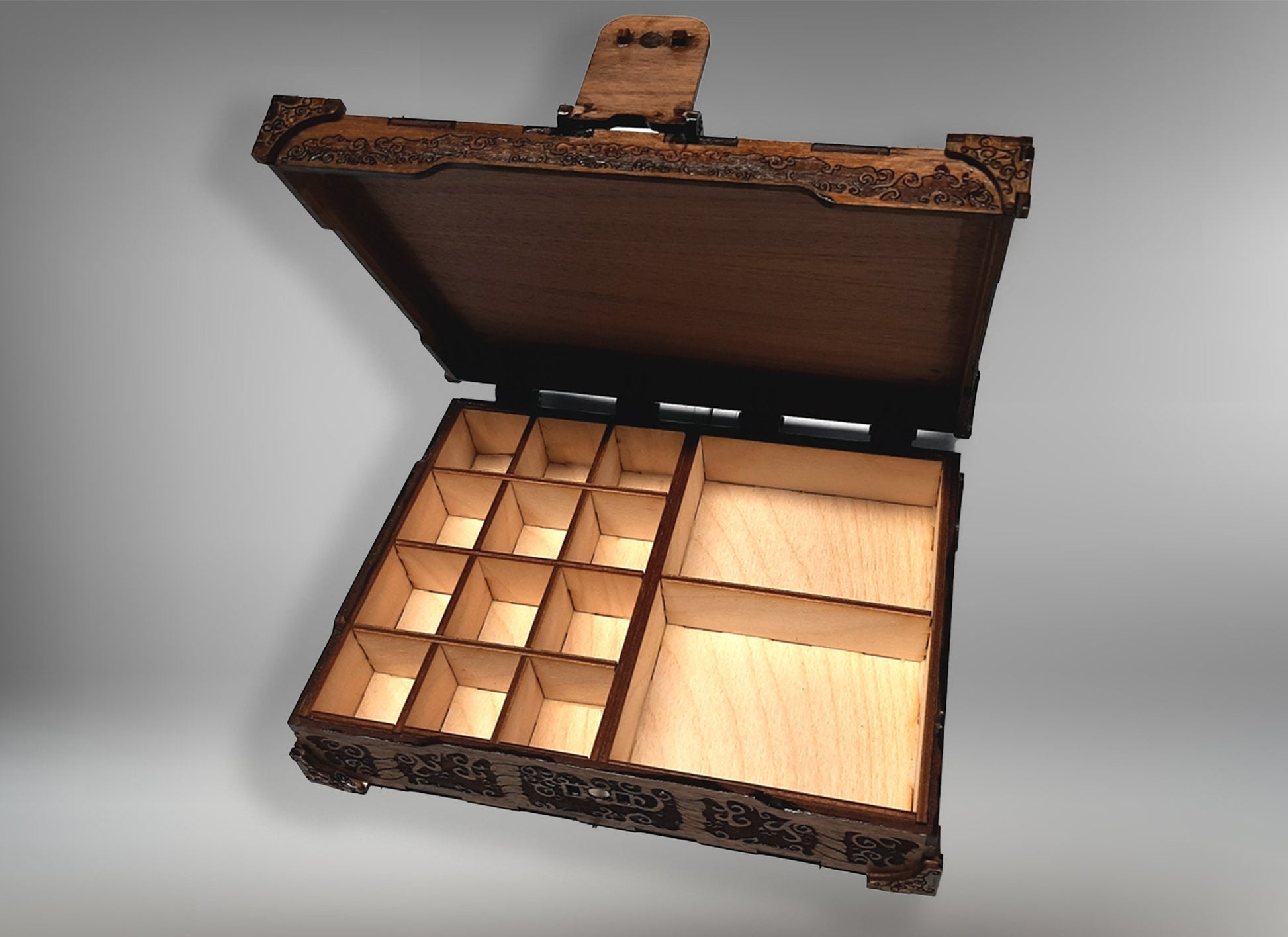 Keep your jewelry or RPG minis safe and protected in royal style! The beautiful engravings that adorn the outside of the box give a very classy and gorgeous look to this hand crafted box. Personalize the lid with a monogram of your choice. Pick the font set and just type the letter that you would like engraved into the lid in the personalization box when you check out. The box has 12 smaller compartments (approx 1.25" square) spaces for dice/mini storage or smaller jewelry and two larger areas (4" x 5" each) for larger pieces.