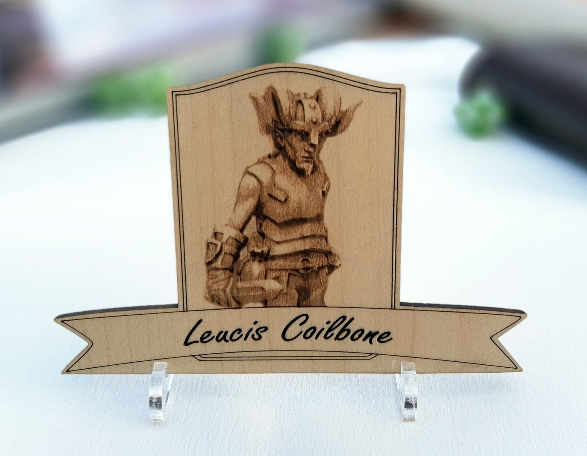 The character's portrait will be engraved into the wood with a state of the art laser, giving it dimension and depth. Your new Table Topper comes with two acrylic feet to allow it to easily be displayed.