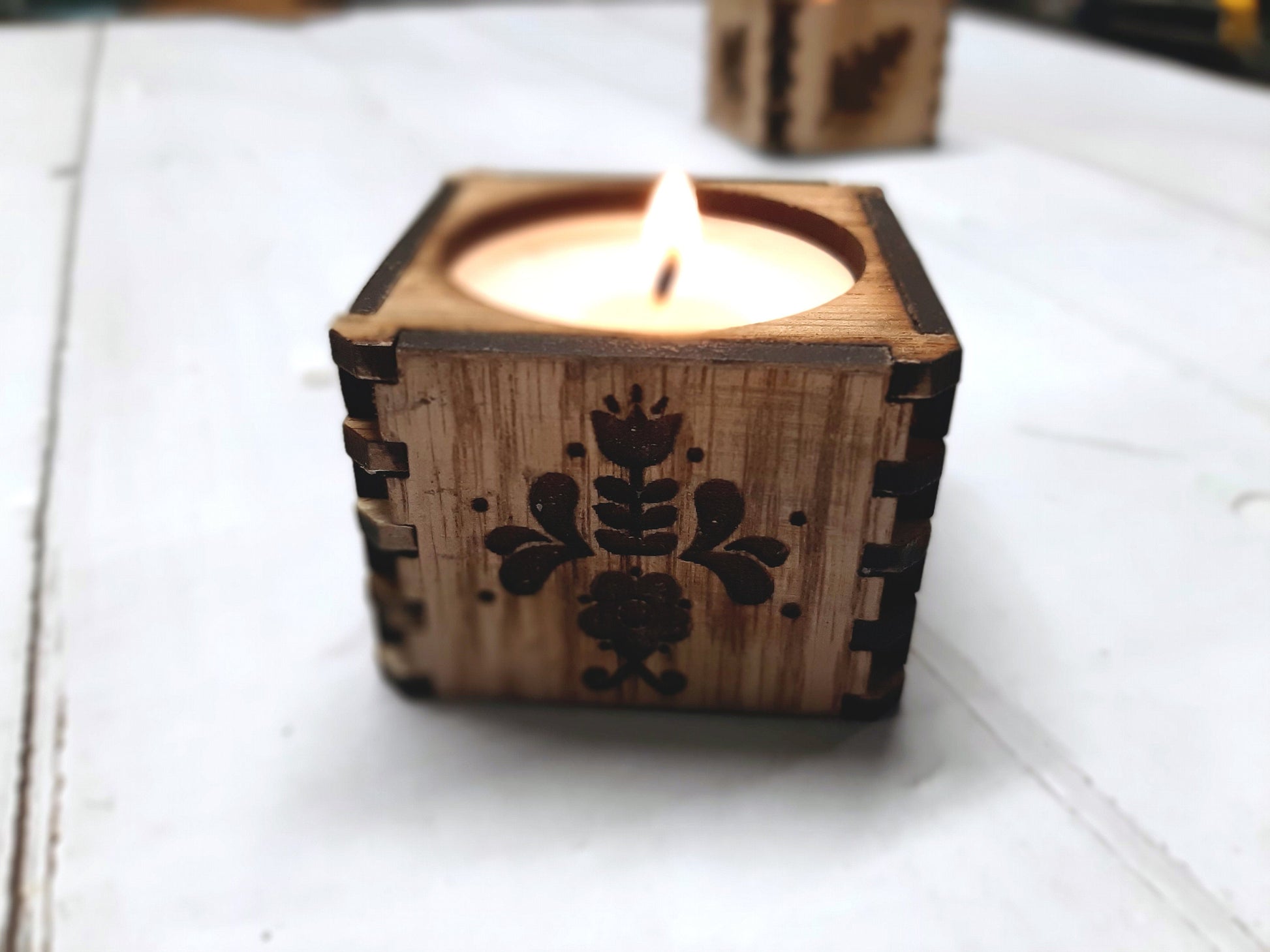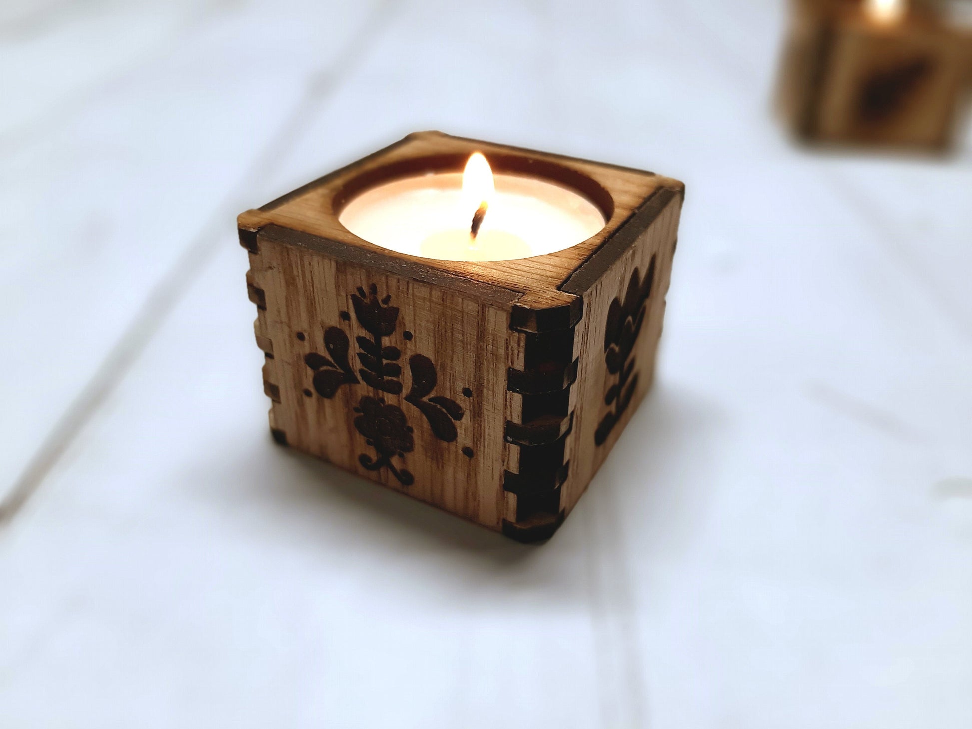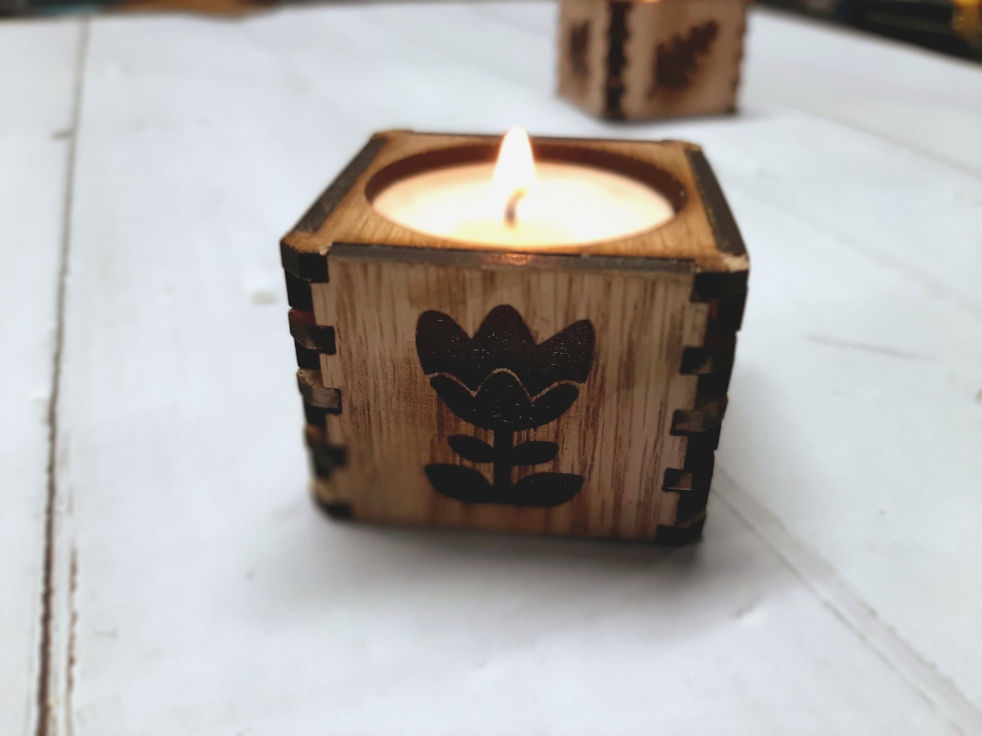 I cut the wooden patterns out and hand assemble each candle holder. I've added a small finger sized hole underneath to help make extracting the used tealight candle when it has been depleted. A simple joy to add compounding elegance to your home!